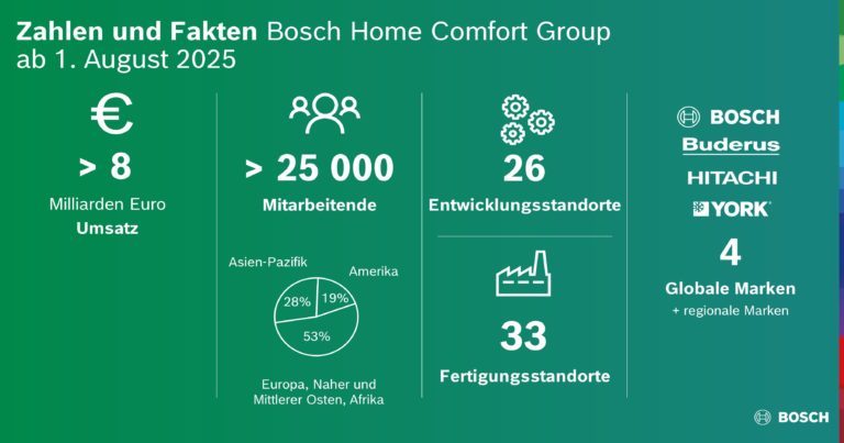 Der Bosch-Geschäftsbereich Home Comfort verdoppelt sich mit dem Zukauf nahezu auf über 25 000 Mitarbeitende und mehr als acht Milliarden Euro Umsatz. Vor allem in Amerika und Asien baut Bosch seine Präsenz damit deutlich aus und wird zu einem der größten Anbieter im Markt für das Heizen, Lüften und Kühlen von Wohn- und kleinen Gewerbegebäuden weltweit. „Die gesamte HVAC-Branche ist im Umbruch, Markt und Technologien wandeln sich. Bosch nutzt seine Chancen konsequent und steigt im Heizungs-, Lüftungs- und Klimalösungsgeschäft jetzt in die Champions League auf“, so Hartung.
