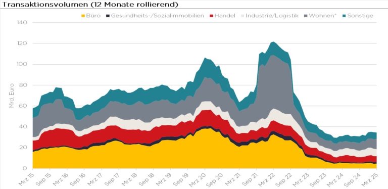 Am deutschen Immobilieninvestmentmarkt wechselten in den vergangenen zwölf Monaten Gewerbe- und Wohnimmobilien* für ca. 34,6 Mrd. Euro den Eigentümer. Gegenüber der Vorjahresperiode (April 2023 bis März 2024) bedeutet dies einen Anstieg um 12 %. Auf das 1. Quartal 2025 entfielen ca. 6,9 Mrd. Euro, was etwa dem Volumen des Vorjahresquartals entspricht (ca. 7,2 Mrd. Euro).