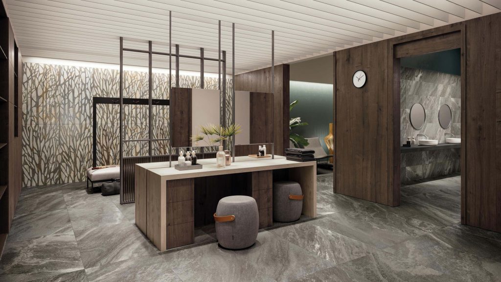 die möglichen dreidimensionalen und haptischen Effekte) wird nicht länger während des Pressvorgangs erzeugt, der repetitiv und daher einschränkend ist, sondern wird digital gedruckt, sodass sie vollkommen mit den digitalen Dekoren (Marmor-, Stein- und Holzeffekte, etc.) synchronisiert ist. Die Synchro Digit Piemme Technologie nutzt eine spezielle Software, die das erste Auftragen der Relief-Glasuren steuert, um so eine drei dimensionale Oberfläche mit nahezu unendlichen Varianten zu erzeugen. Dieser Vorgang wird dann mit einem zweiten digitalen Glasurauftrag synchronisiert, um den gewünschten grafischen Effekt zu generieren. Daher der Name der Technologie: „Synchro Digit Piemme“. Evoluta ist daher das neue Gesicht der 3.0 Fliese, die jedes Naturmaterial auf einem extrem realistischen Level nachbilden kann. Die Kollektion ist in fünf Farben und drei Größen verfügbar.