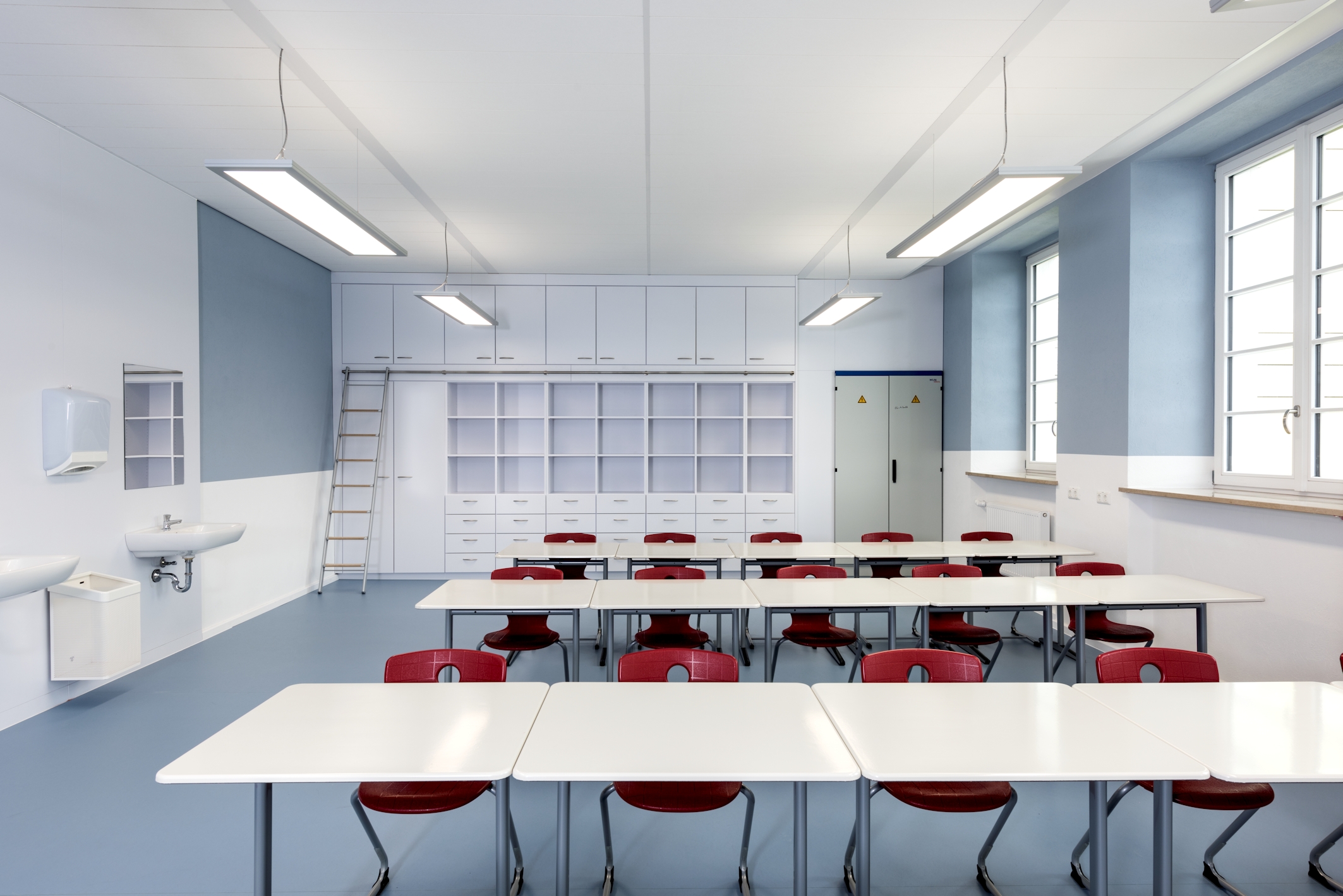 In den Treppenhäusern kam eine Variante der visula als Wandleuchte zum Einsatz – eine Sonderanfertigung, die auf die Anforderungen im Schulgebäude abgestimmt wurde. Ein großer Vorteil war, dass sich modernes Lichtmanagement in die Leuchten einfach und sicher integrieren ließ. In den Klassenzimmern konnte problemlos eine Zwei-Kreis-Dimmung realisiert werden, so dass die Leuchten im vorderen Bereich beim Einsatz eines Beamers getrennt angesteuert werden können. Die Beleuchtung wird durch das KNX-System präsenzabhängig gesteuert. In den abgehängten Decken integrierte Präsenzmelder sorgen dafür, dass das Licht komplett abgeschaltet wird, sobald der letzte Schüler den Raum verlassen hat – dadurch werden weitere hohe Energieeinsparungen erzielt.