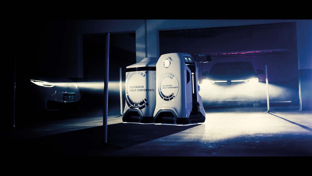Die Volkswagen-Abteilung Group Components hat den Prototyp seines mobilen Laderoboters (Foto) fertiggestellt. Er soll vollautonomes Laden von Fahrzeugen in begrenzten Parkräumen wie Tiefgaragen ermöglichen. Der Laderoboter wird über eine App oder Car-to-X-Kommunikation gestartet und agiert vollkommen autonom. Er steuert eigenständig das zu ladende Fahrzeug an und kommuniziert mit ihm: vom Öffnen der Ladeklappe, über das Anschließen des Steckers bis hin zum Entkoppeln. Der gesamte Vorgang verläuft ohne menschliche Beteiligung. Um mehrere Fahrzeuge gleichzeitig laden zu können, bringt der mobile Roboter einen Anhänger als fahrbaren Energiespeicher zum Fahrzeug, schließt diesen an und lädt damit die Batterie des E-Fahrzeugs auf.