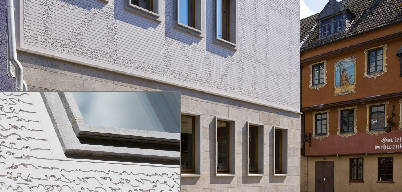 Wie ein Ersatzbau harmonisch in den Bestand eingefügt werden kann, Eigenständigkeit und Modernität ebenso zeigt wie Respekt vor dem Traditionellen und so Bauherr und Denkmalschützer gleichermaßen beeindruckt, ist jetzt in Frankfurt zu sehen: Der Bestandsbau war so marode, dass er sich nicht erhalten ließ. Der Neubau „Kleiner Ritter“ nimmt die alte Kubatur auf und setzt auf zeitgemäße Optik. An das einstige Fachwerk erinnert eine kurvenreiche, sich verdichtende Linie, die im Rahmen eines digitalen Entwurfs und Fertigungsprozesses in Plan-Fassadenplatten von StoDeco, Stühlingen, eingefräst wurde.