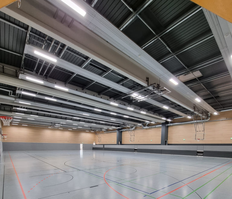 Die schmalen Abschnitte zwischen den Leuchten, z. B. aus der Serie Lumina Flatline, werden mit Blindblechen ausgestattet, damit sich eine vollflächige Ansicht bietet. In diese Elemente lassen sich zusätzlich jederzeit Präsenzmelder, bauseitige Lautsprecher etc. einbauen. Bei Bedarf wird auch eine Notbeleuchtung integriert. In Sporthallen können zudem Ballschutzkörbe ergänzt werden.