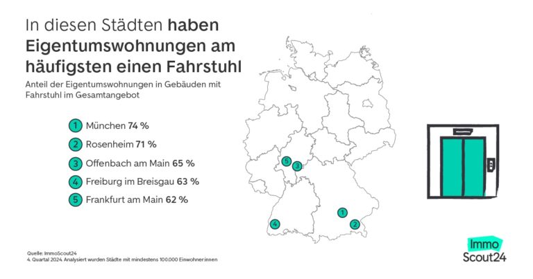 • In München können 74 Prozent der angebotenen Eigentumswohnungen mit Fahrstuhl erreicht werden – in Erfurt sind es nur 8 Prozent.