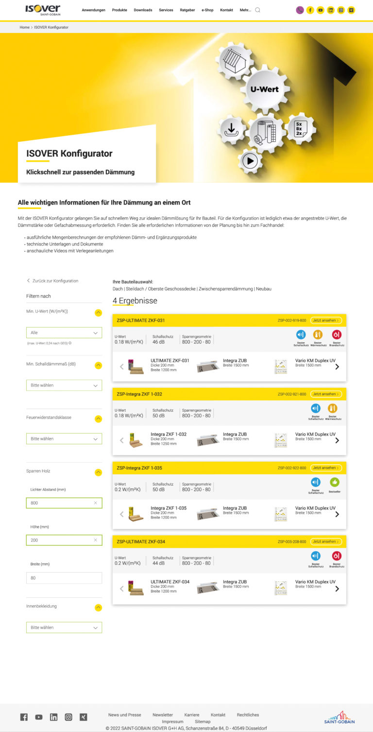 Um mit der Konfiguration zu beginnen, ist lediglich die Eingabe der individuellen Anforderungen, wie etwa der angestrebte U-Wert, die Dämmstärke oder Gefachabmessungen, erforderlich. Auf der Ergebnisseite kann das Anforderungsprofil gegebenenfalls noch einmal verändert werden. Nach Auswahl der gewünschten Konstruktion bietet der Konfigurator eine Reihe hilfreicher Services wie anschauliche Visualisierungen zum Aufbau des Bauteils oder eine ausführliche Mengenberechnung, die sich bequem herunterladen lässt und den Einkauf im Fachhandel wesentlich einfacher und zeitsparender macht. Zudem bieten bereitgestellte Videos mit entsprechenden Verlegeanleitungen vielfältige Informationen zur Verarbeitung. Auch der Zugang zu den technischen Unterlagen wie Leistungserklärungen, Umwelt-Produktdeklarationen, Sicherheitsdatenblättern sowie relevanten Zertifikaten und Prüfzeugnissen ist mit nur wenigen Klicks so einfach wie möglich gehalten.