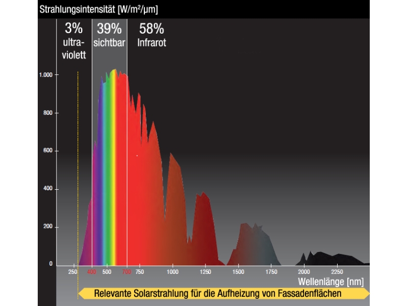 In der bisherigen Betrachtung des Hellbezugswerts bleibt unberücksichtigt, dass das menschliche Auge nur elektromagnetische Strahlung in Wellenlängen von 400 bis 700 Mikrometer (μm) wahrnimmt. Die Energie der Sonnenstrahlen dagegen liegt im Infrarotbereich und somit zwischen 700 bis 2500 μm. Und genau hier liegt der wesentliche Unterschied, da das Aufheizen der Fassadenoberfläche eben nicht nur durch die infrarote und ultraviolette Strahlung, sondern die gesamte Solarstrahlung, verursacht wird. Diese Tatsache wurde bei der Neuentwicklung der bereits erwähnten Fassadenbeschichtungen berücksichtigt. Infolgedessen werden sich zukünftig Farbtonbeschränkungen nicht mehr am Hellbezugswert orientieren, sondern an der gesamten solaren Reflexion einer Beschichtungsoberfläche. Diese wird unter dem Kürzel TSR (= Total Solar Reflectance) definiert und erscheint zunehmend auf den technischen Merkblättern der Farbenindustrie. Im Gegensatz zum Hellbezugswert wird der Wert der gesamten solaren Reflexion allerdings von den verwendeten Pigmentkombinationen beeinflusst. Hierfür werden spezielle Titandioxidpigmente eingesetzt, die das Sonnenlicht hauptsächlich im Infrarotbereich ab rund 700 μm Wellenlänge reflektieren. Genau dieser Bereich ist mit über 50 Prozent am Aufheizen der Fassadenoberfläche verantwortlich.
