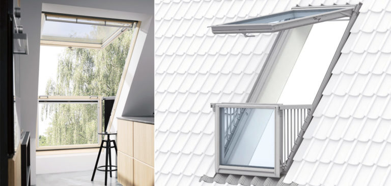 Die aus zwei Teilen bestehende System-Lösung „Cabrio“ lässt sich mit nur wenigen Handgriffen zu einem balkonähnlichen Dachaustritt ausklappen. Hierbei öffnet sich der obere Klapp-Schwing-Flügel des Fensters bis zu 45 Grad, während der untere Teil des Fensters bis zur Senkrechten herausgedrückt wird und die Seitengeländer aufklappen. Bewohner können so bequem im offenen Fenster stehen und den Blick ins Freie genießen. Im Gegensatz zum Bau eines Balkons ist die Installation dieses Dachfensters in der Regel genehmigungsfrei.