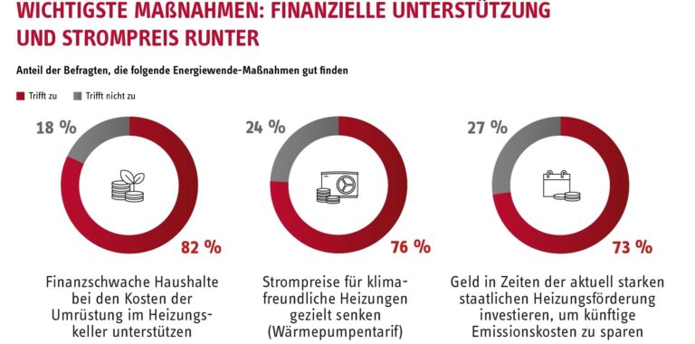 73 Prozent der privaten Haushalte in Deutschland sprechen sich dafür aus, die aktuell starke staatliche Heizungsförderung für Investitionen zu nutzen, um künftige Emissionskosten zu sparen. Die Bundesregierung stellt mit dem Neustart der Förderung für den Austausch alter Heizungen gegen umweltfreundliche Alternativen wie die Wärmepumpe 16,7 Milliarden Euro für das Jahr 2024 zur Verfügung, um Verbraucherinnen und Verbraucher zu unterstützen. Zusätzlich flankiert ein KfW-Programm mit zinsgünstigen Krediten.