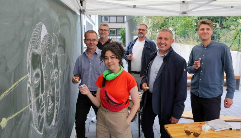„Happy Birthday, Maja“, mehrere Autos, Herzen, ein Notenschlüssel: Die „bemalbare Wand“ am MartiniTor, dem Neubauprojekt der Unternehmensgruppe Nassauische Heimstätte | Wohnstadt (NHW) in Kassels Vorderem Westen ist genau das, was sie sein soll: Ein Treffpunkt für alle, die kreativ sein, sich künstlerisch betätigen oder eine mehr oder weniger wichtige Botschaft hinterlassen wollen. Vor kurzem haben Vertreter von Hessens größtem Wohnungsunternehmen, darunter Regionalcenterleiter Sascha Holstein und Servicecenterleiter Matthias Otto, zusammen mit der Kasseler Künstlerin Aliaa Abou Khaddour sowie Mieterinnen und Mietern die Wand im Rahmen eines Nachbarschaftsfests bemalt und eingeweiht. Genau genommen sind es sogar fünf Wände: je ca. zehn bis zwölf Quadratmeter große Flächen, die sich am Verbindungsweg zwischen Uhlandstraße und der Straße Am Alten Sudhaus entlangziehen. Die Tafelfarbe verwandelt die Wand in eine Schultafel, wie man sie aus dem Klassenraum kennt. Sie lässt sich besonders leicht auftragen und verarbeiten, ist wasserbasiert und damit ungiftig. Kleine und große Künstler können die Wand mit echten Tafelkreiden beschriften oder bemalen und anschließend mit Wasser abwischen. Eine tolle Sache gerade für Eltern – schließlich müssen sie nicht mehr den Atem anhalten, wenn der Nachwuchs sich kreativ austoben möchte. Kreide, Eimer und Schwämme stellt die NHW zur Verfügung, nur um das Wasser müssen sich die Künstler selbst kümmern.