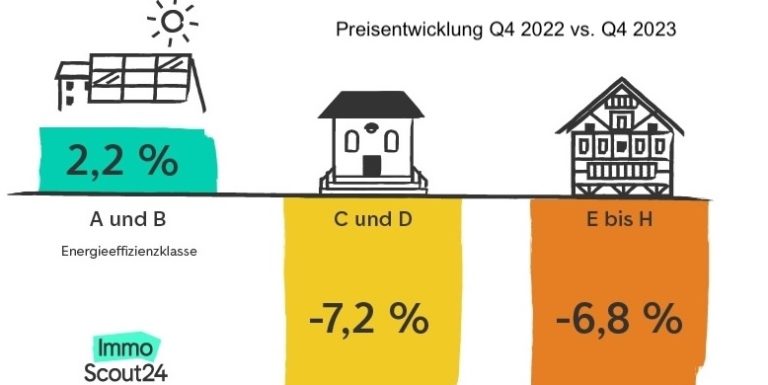 Eine aktuelle Auswertung von ImmoScout24 zeigt, wie sich die Preise für Immobilien je nach Energieeffizienzklasse im Jahresvergleich entwickeln, wie hoch der Sanierungsbedarf in Deutschland ist und wie es um die energetische Sanierung von Wohnimmobilien steht: Preise für Immobilien der Klassen A und B steigen im Jahresvergleich um 2 Prozent, während die Preise für Immobilien der Klassen C bis H rund 7 Prozent nachgeben. Der Sanierungsbedarf in Deutschland ist weiterhin hoch. 42 Prozent der Immobilien auf ImmoScout24 haben eine Energieeffizienzklasse schlechter als D. Gleichzeitig werden im Vergleich zu 2019 rund 33 Prozent weniger Objekte neu saniert. Der neue Modernisierungsrechner der Online-Plattform zeigt, wie energetische Sanierungsmaßnahmen den Wert einer Immobilie beeinflussen, was diese kosten und wie hoch die Förderung sein kann.