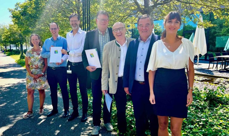 Foto: Als Dank und Anerkennung hat das Unternehmen BAYERNOIL die Urkunde „Umwelt- und Klimapakt Bayern“ erhalten. Im Bild v.l.n.r.: Sandra Schneider, Wirtschaftsreferentin Landratsamt Kelheim, Daniel Dietrich, BAYERNOIL, Christian Schlusemann BAYERNOIL und Leiter HSSEQ, Wouter de Jong, Geschäftsführer BAYERNOIL, Martin Neumeyer Landrat Landkreis Kelheim, Albert Gürtner, Landrat Landkreis Pfaffenhofen a.d.Ilm und Katharina Baschab, Abteilungsleiterin Umwelt/Klima/Gesundheit, Landratsamt Pfaffenhofen a.d.Ilm