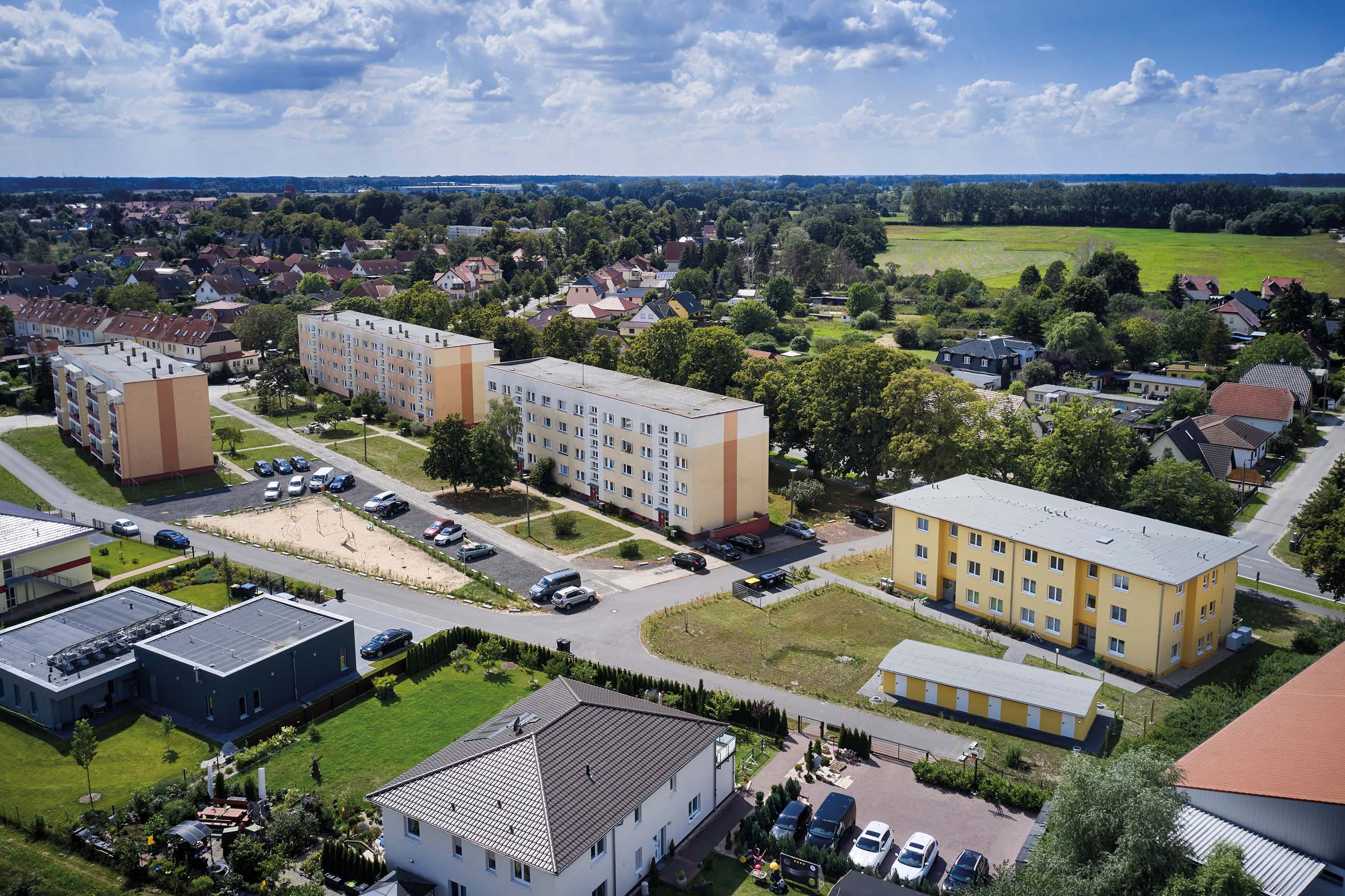 Die Kleinstadt Kremmen in Brandenburg mit ihren rund 7500 Einwohnern, davon 3500 im Ortsverbund, liegt etwa 40 Kilometer Luftlinie nordwestlich von Berlin-Mitte in Höhe von Oranienburg mitten im Havelland. Zu weit entfernt von der Metropole, um noch im Speckgürtel verortet zu werden. Aber nicht so ländlich, dass – wie andernorts – ein signifikanter Rückgang der Einwohnerzahlen zu verzeichnen wäre. Eher im Gegenteil. Entsprechend strategisch entwickelt die Wohnungsbaugesellschaft Kremmen (WOBA) ihren Bestand: Substanzerhalt steht im Vordergrund, flankiert durch behutsame Stadterneuerung und -entwicklung.