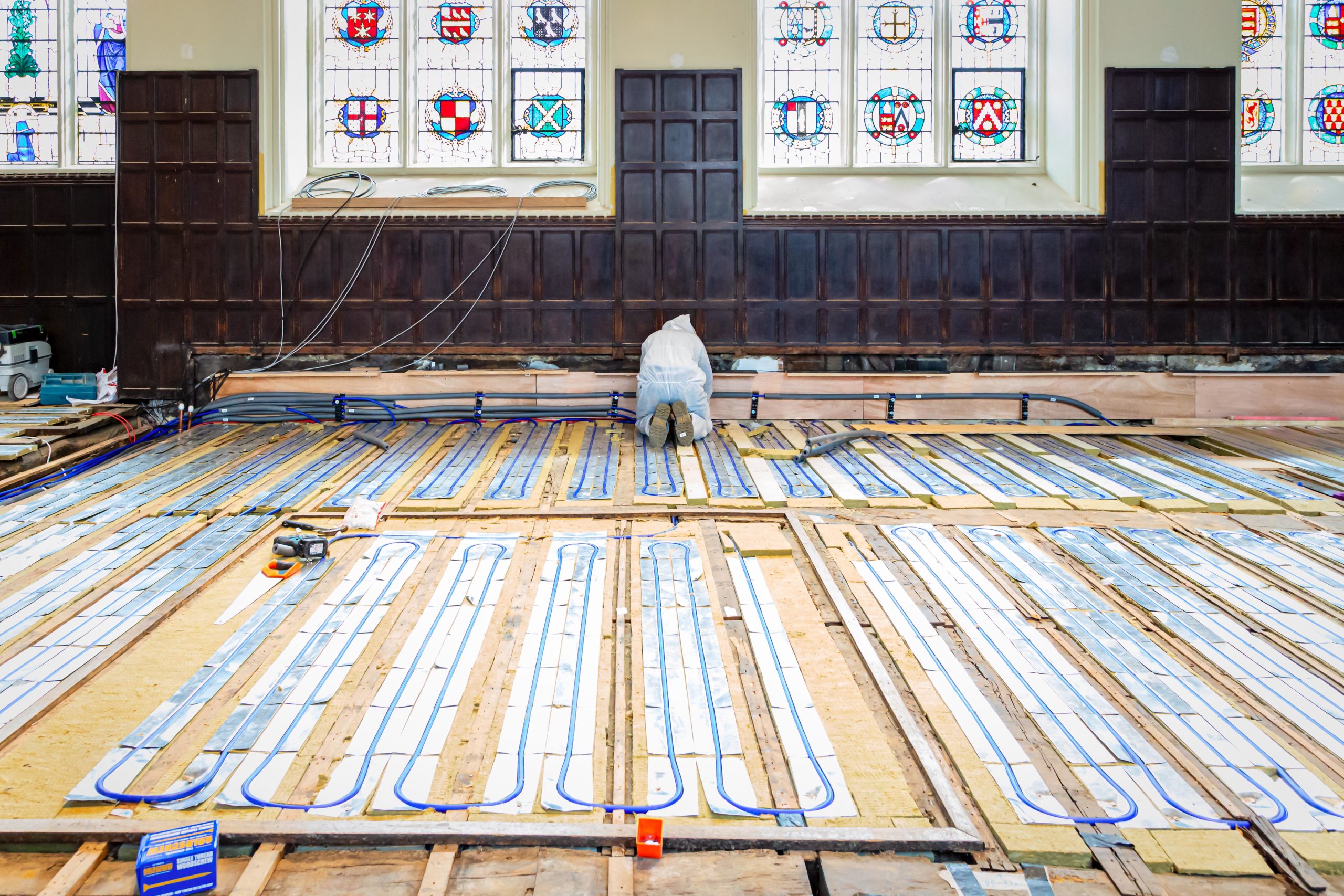 Das international mehrfach ausgezeichnete Architekturbüro 5th Studio (Oxford) stellte bei der Sanierung zwei Bedingungen: ein auf Mineralwolle basierendes Flächenheizungssystem, um brennbare Materialien nach Möglichkeit aus dem Projekt auszuschließen, sowie das Belassen der Fußboden-Balken. Diese stammen zu großen Teilen noch aus der Zeit, als das Gebäude erbaut wurde (1638 bis 1640). Anstatt die alte Holzkonstruktion einzukerben, wurden die Anbindeleitungen entlang der Wände verlegt und die Fußbodenheizung zwischen den Balken installiert.