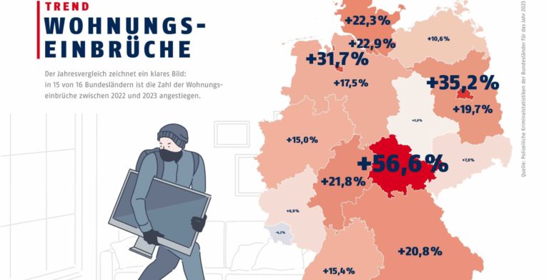 Die bundesweite Kriminalstatistik für das Jahr 2023 weißt 77.819 Fälle von Wohnungseinbruch aus, was einem Plus von 18,1 Prozent gegenüber dem Vorjahreszeitraum entspricht. Nun haben alle Bundesländer ihre detaillierten Fallzahlen veröffentlicht. Mit Ausnahme des Saarlands ist in allen Bundesländern die Anzahl der Wohnungseinbrüche angestiegen, in Thüringen beispielsweise um mehr als 56 Prozent.