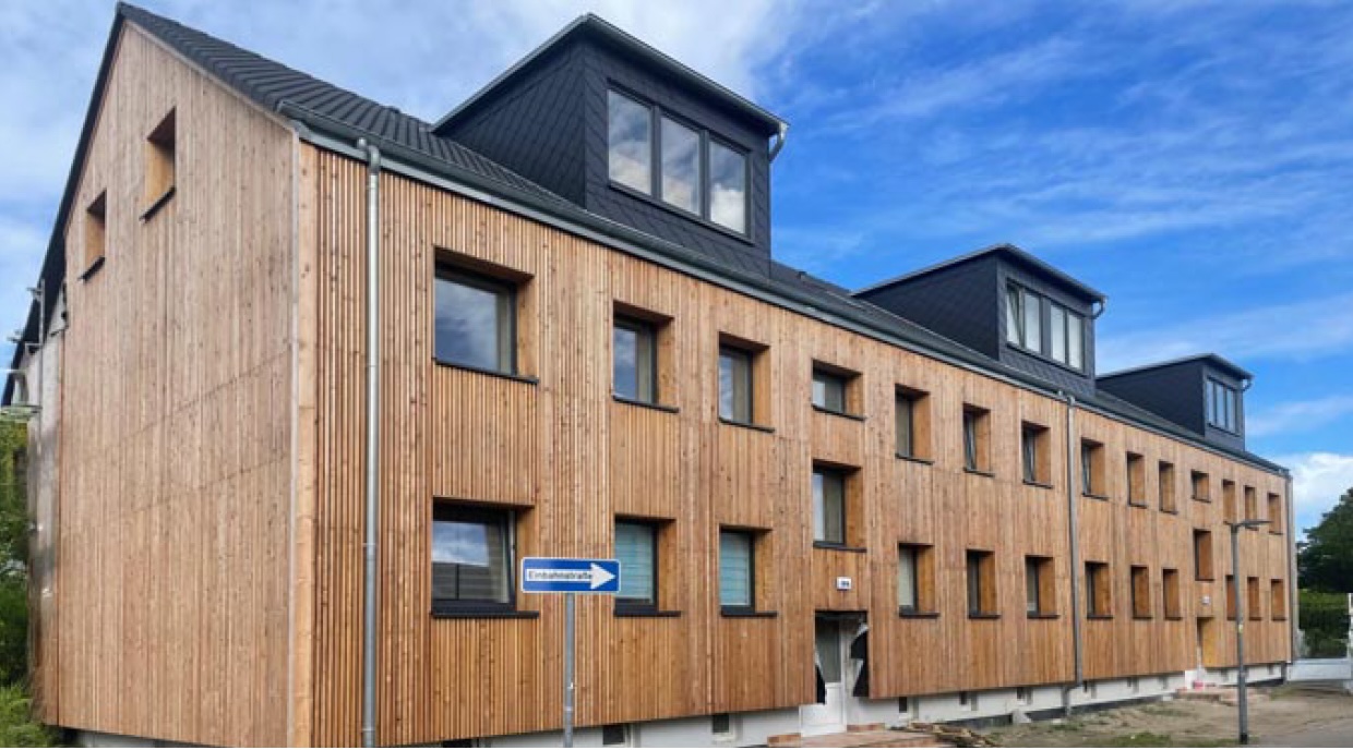 In den 1990er Jahren wurden erstmals Sanierungsarbeiten in der Siedlung durchgeführt: Die Fassaden der Mehrfamilienhäuser wurden mit einem Wärmedämm-Verbundsystem isoliert. Die Fenster, Türen und das Dach verblieben auf dem Stand des Baujahres. Zudem wurden in allen Häusern zentrale Gasheizungen installiert, die die Wohnungen beheizten und mit Warmwasser versorgten. Ein Investor aus Rostock erwarb drei dieser Mehrfamilienhäuser und setzte auf Erdwärme, die Wirtschaftlichkeit und Energieeffizienz gewährleistet: Im ersten Schritt wurde der Wärmeerzeuger in zwei Häusern ausgetauscht und das dritte Gebäude umfassend gemäß KfW-55-Standard saniert. Das Konzept für den Heizungstausch wurde von NIBE in Zusammenarbeit mit der Goldwasser Bohrgesellschaft mbH umgesetzt.