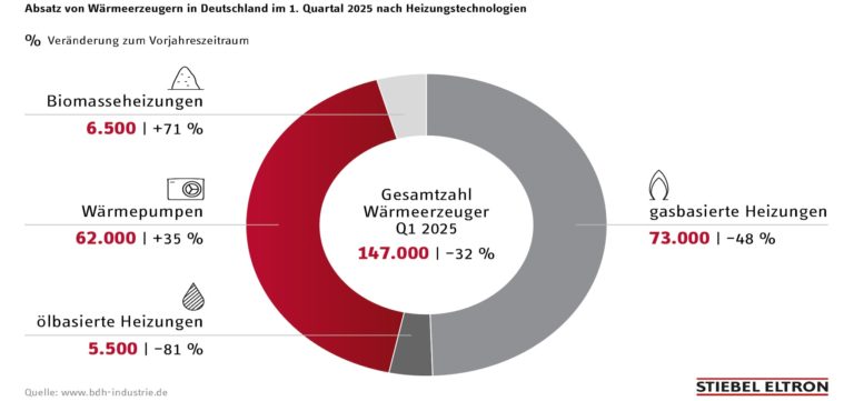 Der Heizungsmarkt in Deutschland zeigt eine dramatische Trendwende: Während der Verkauf von Gas-Wärmeerzeugern im ersten Quartal 2025 um 48 Prozent zurückging und der von Ölheizungen sogar um 81 Prozent einbrach, stieg der Absatz von Wärmepumpenheizungen laut Statistik des Bundesverbandes der Deutschen Heizungsindustrie (BDH) um 35 Prozent an. Damit liegt der Anteil von Wärmepumpen am gesamten Heizungsmarkt in Deutschland im ersten Quartal bei 42 Prozent – ein absolutes Allzeit-Hoch! Das neue Kaufverhalten der Verbraucher hatte sich bereits im Dezember abgezeichnet: In einer Umfrage lehnten 70 Prozent der Kunden eine Ölheizung und 60 Prozent den Einbau eines Gas-Wärmeerzeugers ab. Das sind Zahlen aus dem Energie-Trendmonitor Deutschland 2025, für den ein Marktforschungsinstitut im Auftrag von Stiebel Eltron bevölkerungsrepräsentativ 1.000 Bürgerinnen und Bürger befragte.